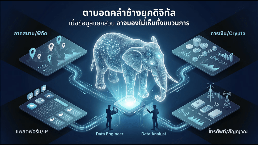 พวกเราคงคุ้นเคยกันดี ที่คนตาบอดต่างคนต่างสัมผัสช้างแล้วเข้าใจไปคนละทิศละทาง… ซึ่งในโลกอาชญากรรมไซเบอร์ที่ซับซ้อนซ่อนเงื่อน การคลำหาความจริงแบบแยกส่วน ไม่ใช่แค่ทำให้เราทำงานช้าลง แต่มันอาจทำให้เรา ‘เดินหลงทาง’ มาตลอดโดยไม่รู้ตัวครับ!